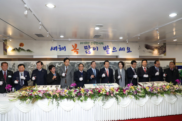 서울 강서구의회 의원들이 최근 강서구민회관 우장홀에서 열린 ‘2018년 강서구 신년인사회’에 참석해 2018년 지역의 평안과 발전을 기원했다. 사진은 신년인사회에 참석한 서울시장과 지역 국회의원, 구청장, 시·구의원들이 축배를 들고 있는 모습. (사진제공=강서구의회)