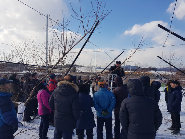 경기 이천시는 최근 장호원 복숭아연구소에서 '2018년 새해농업인 실용교육 복숭아 과정'을 성황리에 마쳤다. 사진은 복숭아연구소 시험포에서 '전정(가지치기) 실습'이 진행 중인 모습. (사진제공=이천시청)