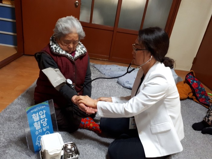 경기 양주시보건소는 최근 동절기 한파·폭설에 따른 취약계층의 피해를 최소화하기 위해 홀몸노인을 직접 방문해 노인의 겨울철 건강관리를 위한 혈압·혈당 검진 등을 실시한다. 사진은 방문 건강관리를 받는 홀몸노인의 모습. (사진제공=양주시청)