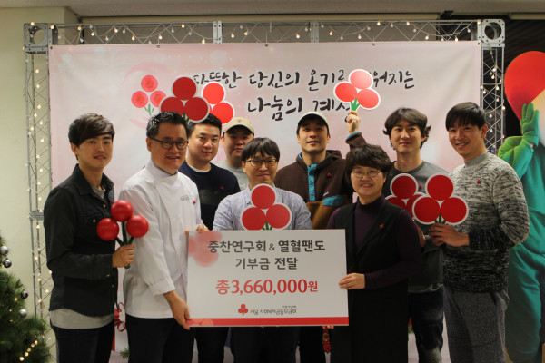 최근 서울 중찬연구회와 열혈팬도가 서울 중구 사랑의열매회관에서 서울 사회복지공동모금회에 어려운 이웃을 위해 ‘2017년 송년자선행사’의 참가비 전액 336만원을 전달했다. 사진은 전달식에 참석한 관계자들이 기념촬영을 하고 있는 모습. (사진제공=사랑의열매)
