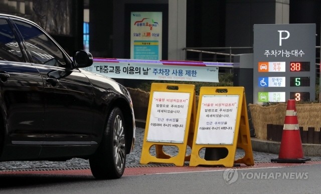 15일 오전 서울시청 주차장 입구에 수도권 미세먼지 저감조치 발령에 따라 주차장을 폐쇄한다는 안내문이 세워져 있다.