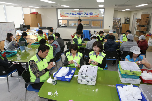 [수원=임종인 기자] 경기 수원시의회 의원봉사단은 최근 수원시호매실장애인종합복지관을 찾아 발달 장애인들의 근로 작업을 도왔다.