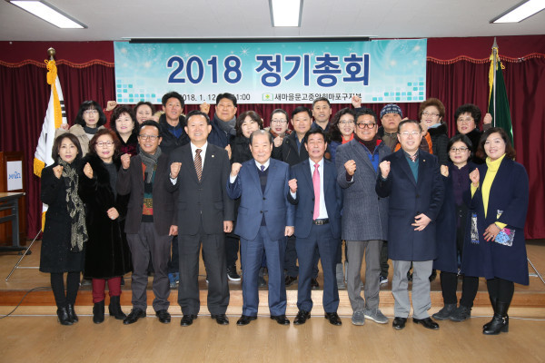 지난 12일 마포구 성산1동 주민센터 1층 강당에서 새마을문고 직·공장 협의회 정기총회가 열렸다. 이날 행사에는 새마을문고 직·공장 협의회 회원 약 50여명이 참석해 2017년 결산 및 2018년 예산안을 보고했다. 사진은 행사에 참여한 마포구청장 및 관계자들이 기념촬영을 하는 모습. (사진제공=마포구청)