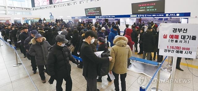 설 연휴 귀성 열차표 현장판매가 시작된 16일 오전 서울역에서 시민들이 열차표를 사기 위해 줄을 서 있다.