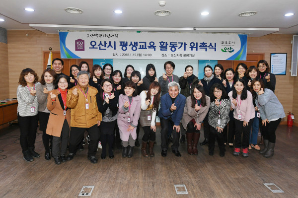 경기 오산시는 15일 시청 물향기실에서 '2018 오산백년시민대학' 활성화를 위한 ‘오산시 평생교육 활동가 위촉식’을 개최했다. 사진은 이날 위촉받은 평생교육 활동가와 시청 관계자 등이 위촉식 후 기념촬영을 하는 모습. (사진제공=오산시청)