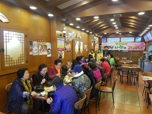 경기 동두천시 중앙동 소재 김밥천국은 16일 지역내 홀몸 노인 20여명을 대상으로 겨울철 지역노인들의 건강을 챙긴다는 취지에서 미역국을 동반한 식사를 대접했다. 사진은 지역노인들이 식사를 하고 있는 모습. (사진제공=동두천시청)