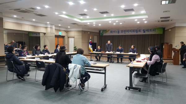 경기 수원시 팔달구 화서1동 주민자치위원회는 16일 행정복지센터 대회의실에서 주민자치위원과 시의원 등 20여명이 참석한 가운데 지역현안에 대한 논의 및 시정홍보를 위한 새해 첫 정례회의를 개최했다. 사진은 참여자들이 회의를 하는 모습. (사진제공=팔달구청)