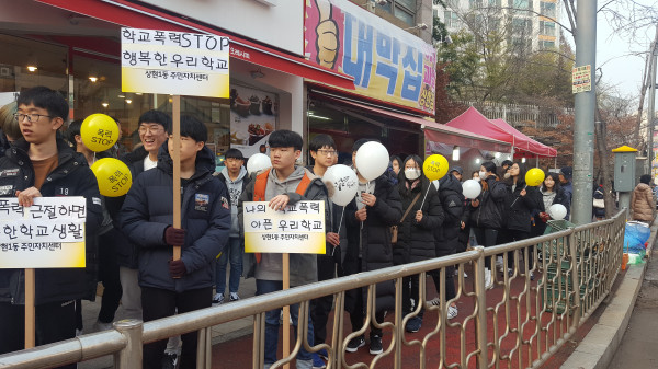 경기 용인시 수지구 상현1동은 17일 주민자치위원회에서 겨울방학을 맞아 지역내 중고생 70명을 대상으로 학교폭력 예방교육을 하고 거리 캠페인을 실시했다. 사진은 학생들이 학교폭력 예방 문구가 적힌 피켓을 들고 있는 모습. (사진제공=용인시청)