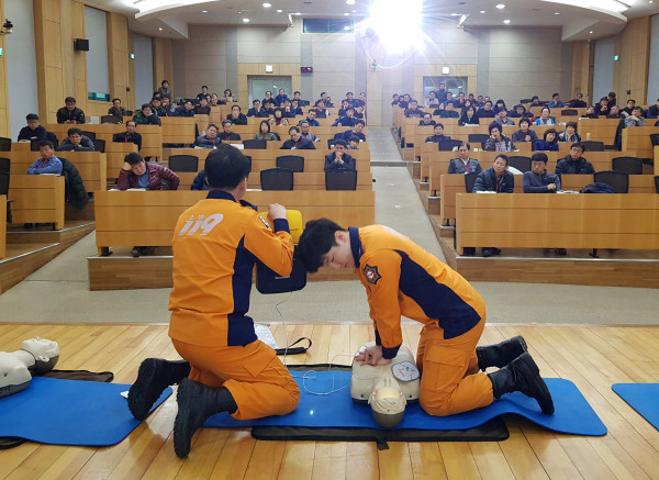 서울 은평소방서는 지난 16일 오후 1시 서울시 인재개발원 다산홀에서 '제1기 5급 승진리더과정' 교육생 96명을 대상으로 응급처치 교육을 실시했다. 사진은 소방관들이 심폐소생술 실습 교육을 진행하는 모습. (사진제공=은평소방서)