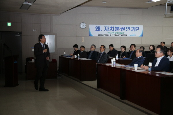 마포구는 지난 17일 구청 4층 시청각실에서 ‘왜, 자치분권인가?’를 주제로 수요강좌를 개최했다. 이날 강의에는 마포구청장을 비롯한 구청 직원 80여명이 참석했다. 사진은 이기우 인하대 법학전문대학원(로스쿨) 교수가 강의를 진행 중인 모습.(사진제공=마포구청)