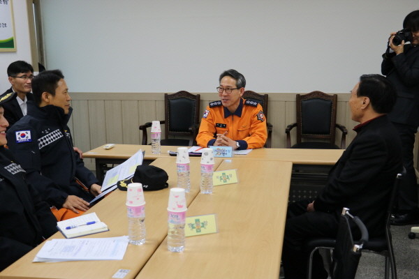 경기 안성소방서는 지난 17일 이재열 경기도재난안전본부장과 함께 금광면에 위치한 엔젤요양병원을 방문했다. 사진은 참여자들이 엔젤요양병원 현장안전컨설팅을 위해 회의하는 모습.(사진제공=안성소방서)