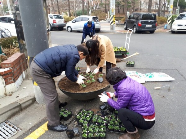 경기 수원시 권선구 권선1동은 지난 19일 청사 앞에서 마을만들기협의회를 비롯한 단체원 15명이 화단 가꾸기에 나섰다. 사진은 참여자들이 추운 날씨에도 자생능력이 뛰어난 팬지를 식재하는 모습.(사진제공=권선구청)