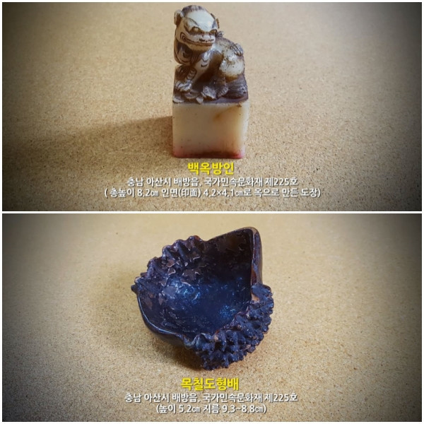 | ▲ (위)백옥방인 (아래)목칠도형배. (사진제공=아산시청) | ||