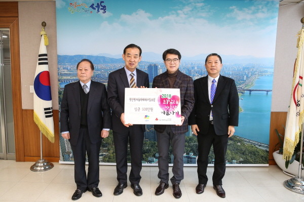 서울 성동구가 지난 17일 용답동 장안평자동차매매사업조합으로부터 조합원들이 자발적 모금 참여로 마련한 성금 500만원을 전달 받았다. 사진은 자동차매매사업조합 및 구청의 관계자들이 기탁식 후 기념촬영을 하는 모습.(사진제공=성동구청)