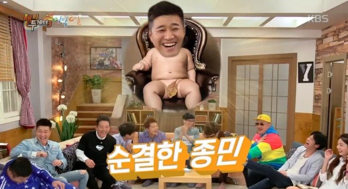 이날 데프콘은 "'1박2일' 녹화 중 옷 갈아입는데 깜짝 놀랐다. 김종민 형의 몸에 털이 하나도 없더라. 백일잔치 아기 같았다"고 폭로해 스튜디오를 초토화했다.