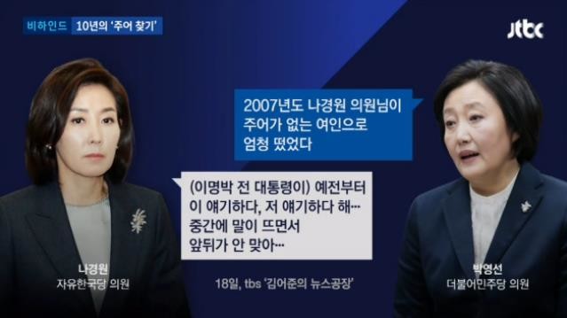 지난 18일 라디오 방송에 출연한 박영선 의원이 나경원 의원에게 “2007년 나경원 의원님이 주어가 없는 여인으로 엄청 떴었다”라고 언급하자, 나경원 의원이 “이명박 전 대통령이 예전부터 이 얘기, 저 얘기하다가 중간에 말이 뜨면서 앞뒤가 안 맞는 경우가 많았다.”고 말해 이목을 집중시켰다.