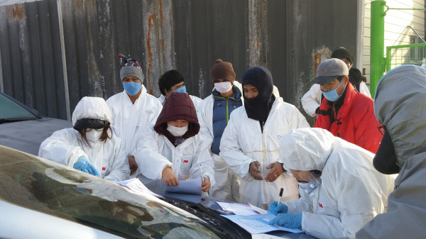 경기 포천시는 최근 고병원성 조류인플루엔자(AI) 고위험군인 AI 발생농가 종사자와 현장대응요원, 살처분 관계자 등을 대상으로 현장 모니터링을 진행했다. 사진은 현장 모니터링에 참여한 관계자들이 설문을 진행하고 있는 모습. (사진제공=포천시청)