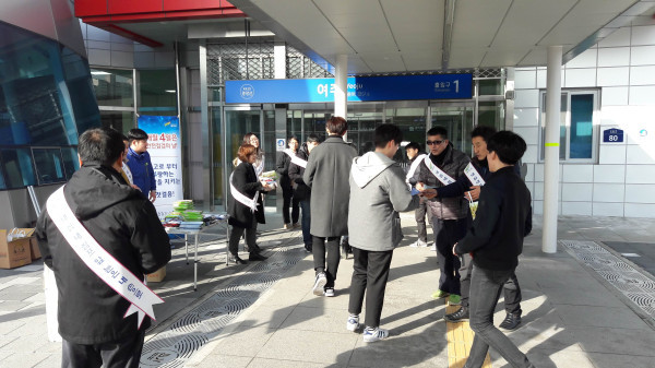 경기 여주시가 최근 경강선 여주역 앞에서 겨울철 재난 예방을 위한 '제262차 안전점검의 날' 캠페인을 실시했다. 사진은 캠페인 문구가 적힌 어깨띠를 두른 시 안전총괄과 직원들이 역사를 방문한 시민들에게 홍보 전단지를 나눠주고 있는 모습. (사진제공=여주시청)