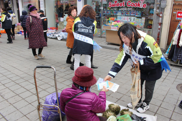 경기 이천소방서는 22일 관고전통시장 일원에서 소방 공무원과 의용소방대원, 이천시청 및 이천경찰서 관계자 등이 참석한 가운데 ‘화재예방 캠페인’을 실시했다. 사진은 캠페인에 참여한 의용소방대원들이 시장 상인들에게 홍보물을 전달하는 모습. (사진제공=이천소방서)