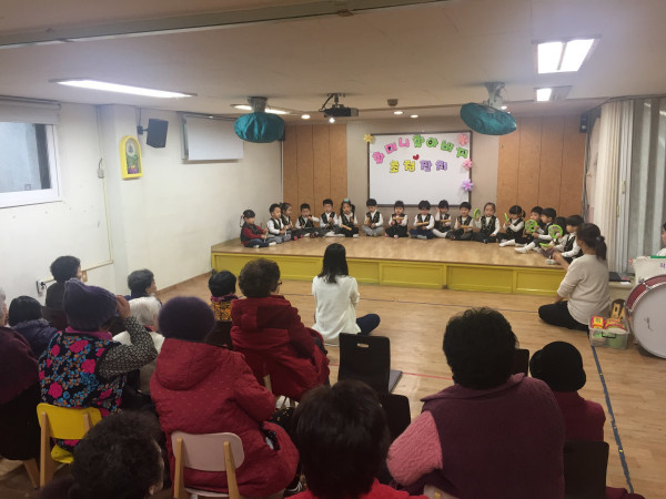 서울 은평구 갈현2동 그리새몬테소리어린이집은 최근 경로당노인 20여명을 아이들이 준비한 재롱잔치에 초청했다. 사진은 어린이집 강당에서 아이들이 공연을 펼치는 모습. (사진제공=은평구청)