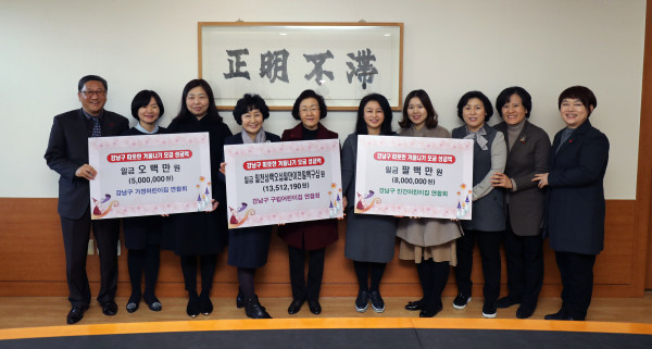최근 서울 강남구가 구청에서 어린이집연합회로부터 어려운 이웃에게 써달라며 후원금 2650만원을 전달받았다. 이번 성금은 강남복지재단 후원금으로 기탁하여 지역내 저소득층 지원에 쓰일 예정이다. 사진은 관계자들이 기념촬영을 하고 있는 모습. (사진제공=강남구청)