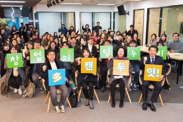 지난 19일 서울 양천구 사회적경제지원센터에서 예비 기업들의 창업을 지원해 지역내 일자리 창출과 지역경제 활성화에 기여할 수 있도록 하는 ‘창업디딤누리’ 개소식을 개최했다. 사진은 참여자들이 '창업디딤누리多캔두잇!' 이라고 적힌 판넬을 들고 기념촬영을 하는 모습. (사진제공=양천구청)