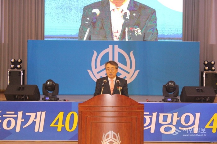 꿀벌신용협동조합 제40차 정기총회가 22일 목상고등학교 체육관인 인동관에서 김학산 이사장, 목포시장, 신협 임직원 및 조합원 등 2000여명이 참석한 가운데 성료됐다. 김학산 이사장이 인사말 하고 있는 모습.