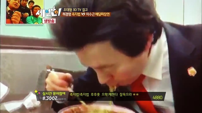 대결에 앞서 허경영 전 총재는 "짜장면을 한번도 먹어본 적이 없다"며 자신없는 모습을 보였다. 하지만 짜장면이 나오자 나무젓가락을 쪼갤 때부터 능숙한 모습을 보이며 '세얼간이'들의 웃음을 유발했다.