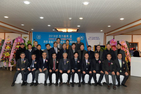 경기 포천시는 지난 22일 늘봄웨딩홀에서 포천융합교류회 제11대 박용수 회장과 제12대 오석준 회장에 대한 '이·취임식'을 개최하고, 지난해 동안 융합교류회를 이끈 박 회장과 주명식 사무국장에게 감사패를 수여했다. 사진은 이·취임식 후 기념촬영을 하는 모습. (사진제공=포천시청)