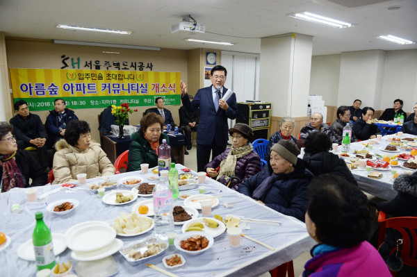 동대문구는 지난 22일 오후 7시 래미안아름숲임대아파트 유휴 공간을 활용한 주민 공유 공간인 ‘커뮤니티실’ 개관식을 개최했다. 사진은 참여자들이 구청장의 인사말을 듣고 있는 모습. (사진제공=동대문구청)
