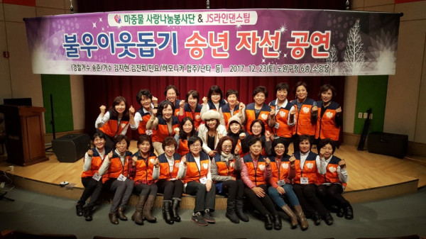 서울 노원구 상계2동 주민센터는 지난달 23일 구청 소강당에서 마중물 사랑나눔 봉사단과 JS 라인댄스팀이 참석한 가운데 ‘불우이웃돕기 송년 자선 공연’을 진행했다. 사진은 행사 종료 후 행사에 참석한 관계자들이 기념촬영을 하는 모습. (사진제공=노원구청)