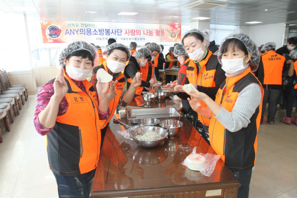 은평소방서는 24일 은평의용소방대원들이 참여한 가운데 '의용소방봉사단 사랑의 나눔활동' 행사를 진행했다. 사진은 의용소방대원들이 만두를 빚으며 기념촬영을 하는 모습. (사진제공=은평소방서)