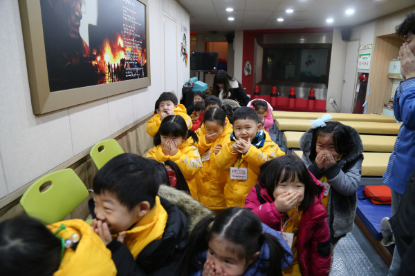 서울 영등포소방서는 지난 23일 오전 홍익어린이집 어린이 60명을 대상으로 소방안전교육을 실시했다. 사진은 어린이들이 화재 시 피난대피 실습을 하고 있는 모습. (사진제공=영등포소방서)