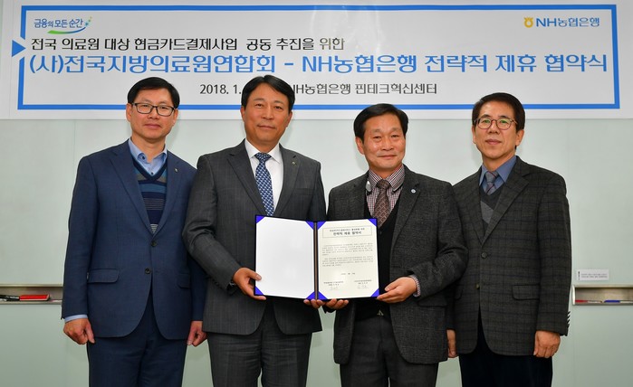 | ▲ (왼쪽부터) 김남열 농협은행 스마트금융부장, 주재승 농협은행 디지털금융부문 부행장, 김진호 (사)전국지방의료원연합회 회장, 김복환 (사)전국지방의료원연합회 사무총장이 23일 서울시 중구에 위치한 NH농협은행 핀테크혁신센터에서 업무협약을 체결한 후 기념촬영을 하고 있다.(사진제공=NH농협은행) | ||