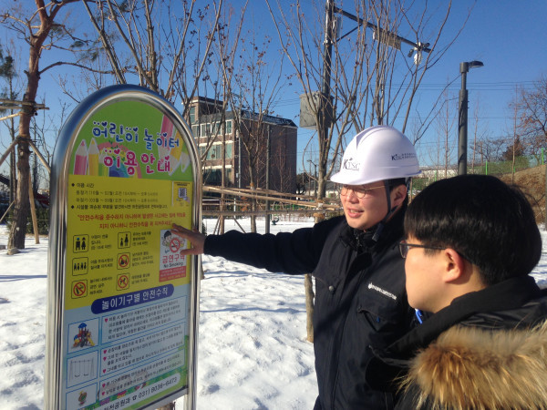 경기 오산시는 최근 지역내 공원공동주택·어린이집 등 어린이놀이시설 329곳에 대한 안전관리 실태를 조사하고 스마트 안전관리시스템 구축을 완료했다. 사진은 어린이놀이시설 이용수칙판에 부착한 QR코드 사용법을 어린이에게 설명하는 직원 모습. (사진제공=오산시청)