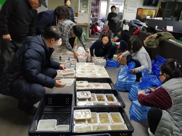 경기 수원시 팔달구 지동 지역사회보장협의체에서는 26일 동 협의체 위원들이 참여한 가운데 밑반찬 만들기 및 배달 행사를 실시했다. 사진은 참여자들이 반찬을 배달하기 위해 준비하는 모습. (사진제공=팔달구청)