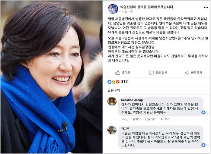 이와 관련해 박영선 의원은 자신의 SNS에 “밀양 세종병원에서 발생한 화재로 많은 국민들이 안타까워하고 계십니다. 생명만큼 귀중한 것이 없습니다. 안타까운 죽음에 대해 깊은 애도를 보냅니다. 어떤 위로로도 그 슬픔을 달랠 수 없다는 것을 알고 있습니다. 유가족 분들에게 진심으로 위로의 마음을 전합니다.”는 글을 올렸다.