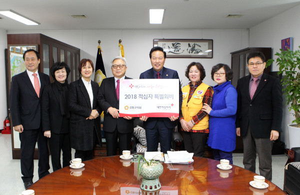 최근 서울 강동구의회가 의장실에서 대한적십자사 서울지사 김흥권 회장과 대한적십자사봉사회 강동지부 임원들을 만나 취약계층 구호활동과 소외된 이웃돕기 등 적십자사의 인도주의적 사업에 써달라며 ‘2018년도 적십자 특별회비’를 전달했다. (사진출처=강동구의회)