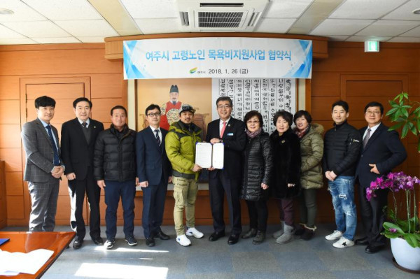 경기 여주시는 지난 26일 ‘여주시 고령노인 목욕비 지원 조례’에 따라 한국목욕업중앙회 여주시지부와 ‘노인 목욕비 지원사업 업무협약’을 체결하고, 만 75세 이상 노인을 대상으로 분기별로 목욕권을 3매씩 지원하기로 결정했다. 사진은 협약식 후 관계자들이 기념촬영을 하는 모습. (사진제공=여주시청)