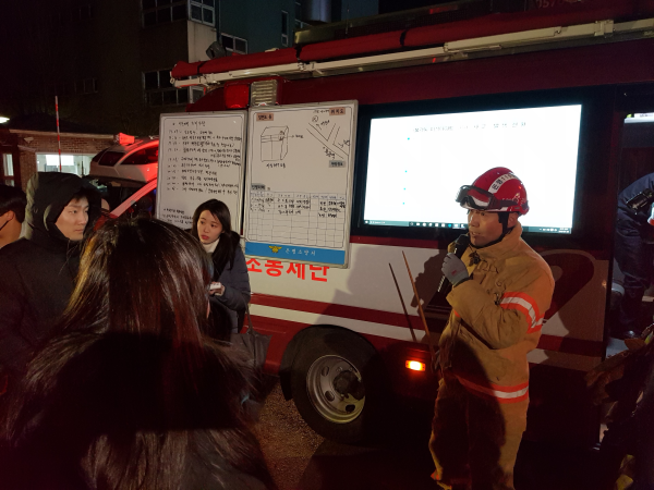 | ▲ 소방서 관계자가 이날 발생한 화재에 대해 브리핑을 하고 있다. | ||