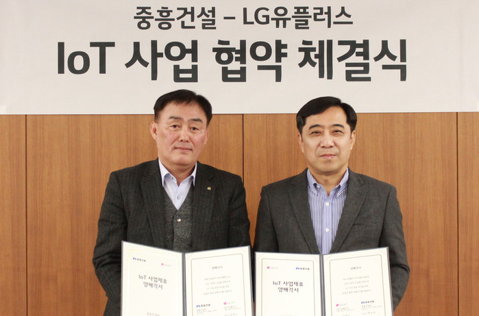| ▲ 안성준 LG유플러스 전무(오른쪽)와 중흥건설 장세면 전무가 업무협약을 체결한 후 기념촬영을 하고 있다.(사진제공=LG유플러스) | ||