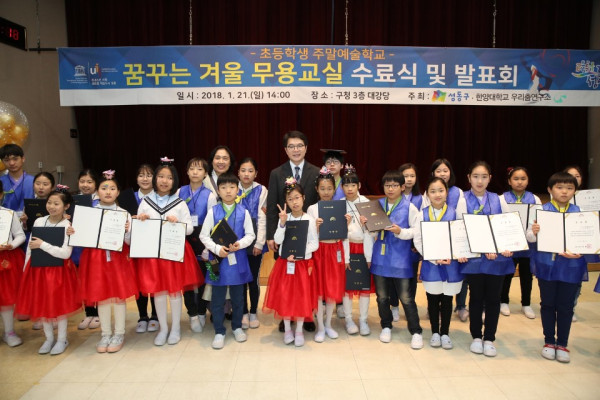 서울 성동구는 최근 구청 대강당에서 꿈꾸는 겨울 무용교실에 참여한 초등학생들이 그동안 배운 실력을 뽐내는 ‘꿈꾸는 겨울 무용교실 발표회·수료식’을 개최했다. 사진은 학생들이 수료증을 전달 받은 후 기념촬영을 하는 모습. (사진제공=성동구청)
