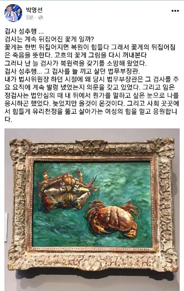 이와 관련해 박영선 의원은 “검사는 계속 뒤집어진 꽃게 일까? 꽃게는 한번 뒤집어지면 복원이 힘들다 그래서 꽃게의 뒤집어짐은 죽음을 뜻한다. 고흐의 꽃게 그림을 다시 꺼내본다. 그러나 난 늘 검사가 복원력을 갖기를 소망해 왔었다.”고 언급했다.