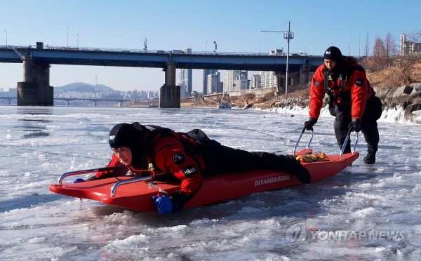 서울소방재난본부 소속 119특수구조단 수난구조대원들이 30일 오전 한강 뚝섬지구 수상에서 해빙기 얇아진 얼음이 깨져 물에 빠지는 사고 발생에 대비해 빙상 인명구조 훈련을 실시하고 있다.