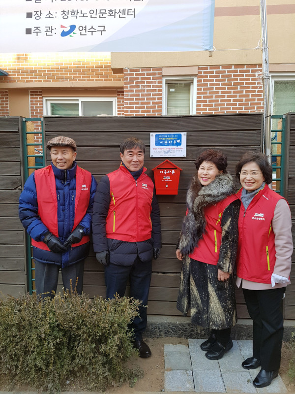 인천 연수구는 29일 연수1동 행정복지센터와 청학동 청학노인문화센터에서 복지통장 등 주민 80여명이 참석한 가운데 소리함 '이웃사촌' 설치식을 개최했다. 이웃사촌은 언제든지 어려운 사연을 알릴 수 있게 24시간 상시 운영된다. 사진은 관계자들이 소리함 앞에서 기념촬영을 하는 모습. (사진제공=연수구청)