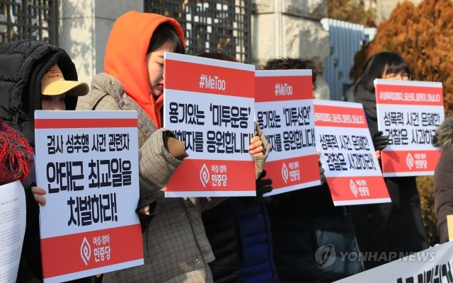 민중당 여성-엄마민중당 당원들이 30일 오전 서울 서초동 대검찰청 앞에서 검사 성추행 사건과 관련해 검찰조직의 공식 사과 및 가해자 처벌을 촉구하는 기자회견을 갖고 있다.