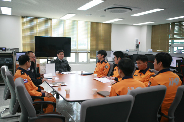 경기 화성소방서는 지난 22~29일 화성지역내 10개 구조·구급대 및 119안전센터를 방문해 현장 활동부서의 근무여건 확인 및 직원들과의 원활한 소통을 위해 '초도순시'를 실시했다. 사진은 29일 동탄2목동119 안전센터를 방문한 소방서장이 직원들과 이야기를 나누는 모습. (사진제공=화성소방서)
