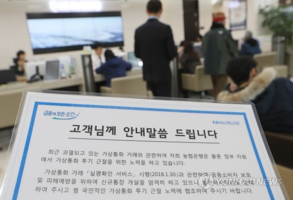 | ▲ 가상화폐(암호화폐·가상통화) 거래 실명제가 시작된 30일 오후 서울 중구 NH농협은행 본점에 안내문이 있다.(사진제공=연합뉴스) | ||
