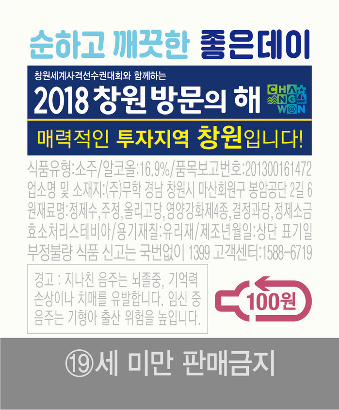 창원시는 ㈜무학과 전격적인 합의하에 인기리에 생산되고 있는 소주 ‘좋은데이’ 1000만병의 보조상표(60×75㎜)에 ‘창원 세계사격선수권대회와 함께하는 2018 창원방문의 해’ 및 ‘매력적인 투자지역 창원입니다!’라는 문구를 게재하고, 라벨이 부착된 제품이 출하 중에 있으며, 2월부터 전국 마트 및 업소에서 구매할 수 있다고 전했다.