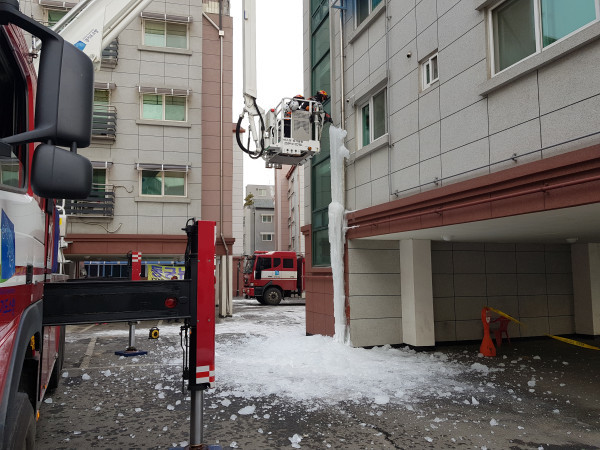 경기 포천소방서 119구조대는 30일 오후 12시50분경 소흘읍 이동교리에 위치한 빌라주택 1~4층 벽에 생긴 고드름 제거 요청을 받고 출동해 안전조치했다. 사진은 소방관들이 코어드릴을 이용해 고드름을 제거하는 모습. (사진제공=포천소방서)